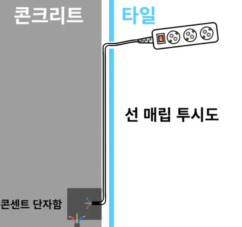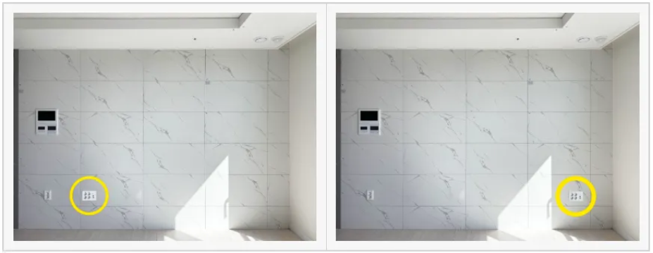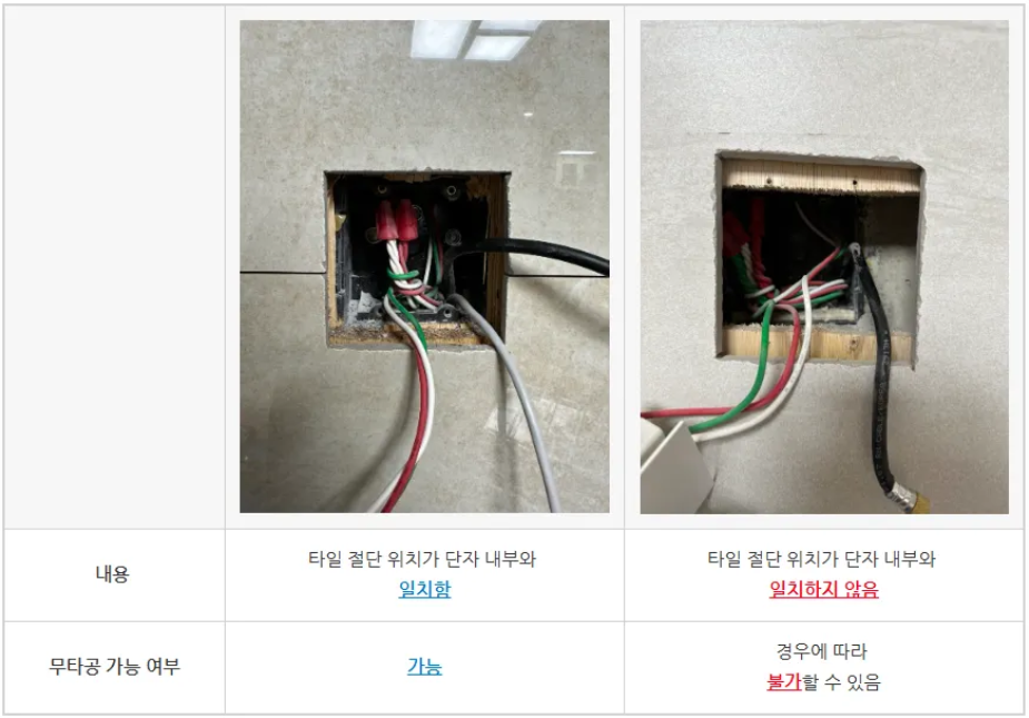 아래와 같은 경우 무타공 시공이 어렵습니다.콘센트 단자함을 탈거 후 정면에서 봤을 때 단자함 내부와 외부 공간이 일치해야합니다.타일 절단된 위치와 내부 공간이 일치되지 않는다면 무타공 시공이 어렵습니다.